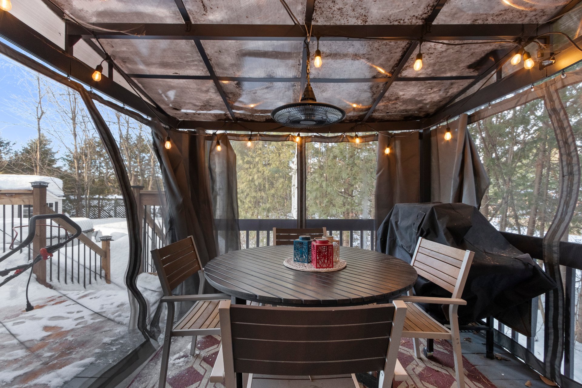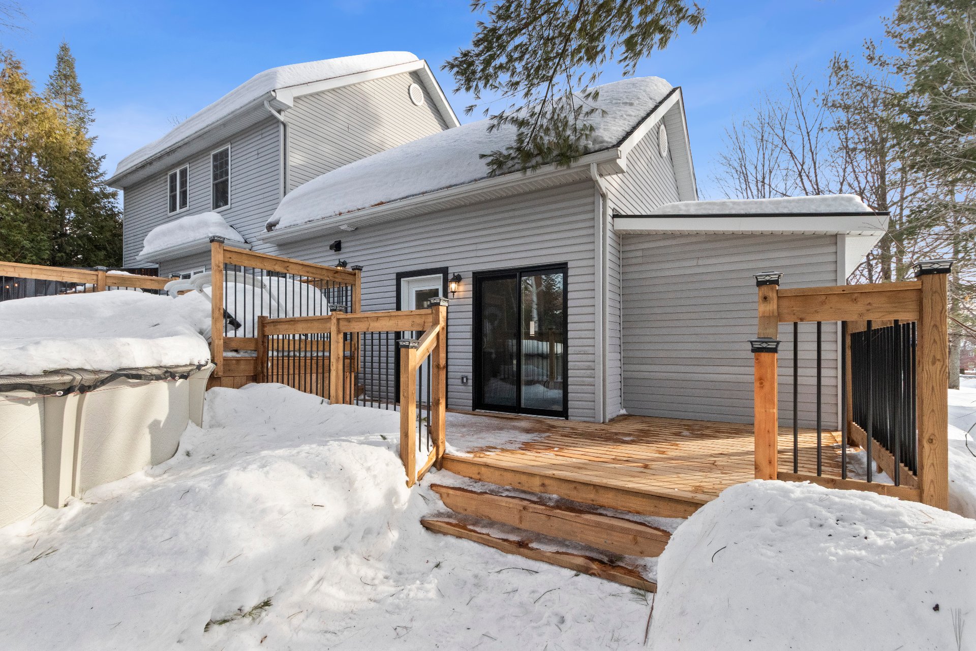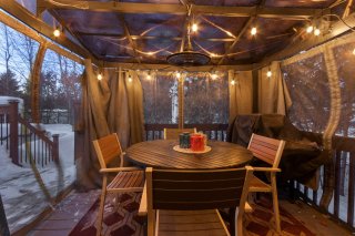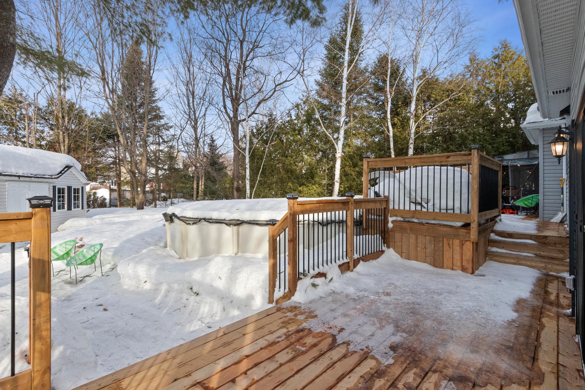 Aménagement extérieur exceptionnel -Immense balcon arrière 12 x 61 pieds -Accès direct du gazebo à la piscine chauffée -Véranda 3 saisons 10 x 20 pieds, adjacente au loft, orientée vers le coucher du soleil -Chargeur pour véhicule électrique niveau 2. -Cabanon spacieux